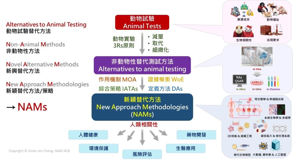 in silico)等多元創新技術與策略,整合應用於化學物質及產品的安全性評估,其目標在於取代(Replace)、減量(Reduce)或優化(Refine)傳統的動物試驗,並補充或改進既有動物實驗數據的不足。基於人類生物學的轉譯性,NAMs能提升測試的科學性和預測準確性,有效降低評估的資源與時間成本,並同時符合動物實驗的3R原則,推動更具倫理且高效的研究模式發展。