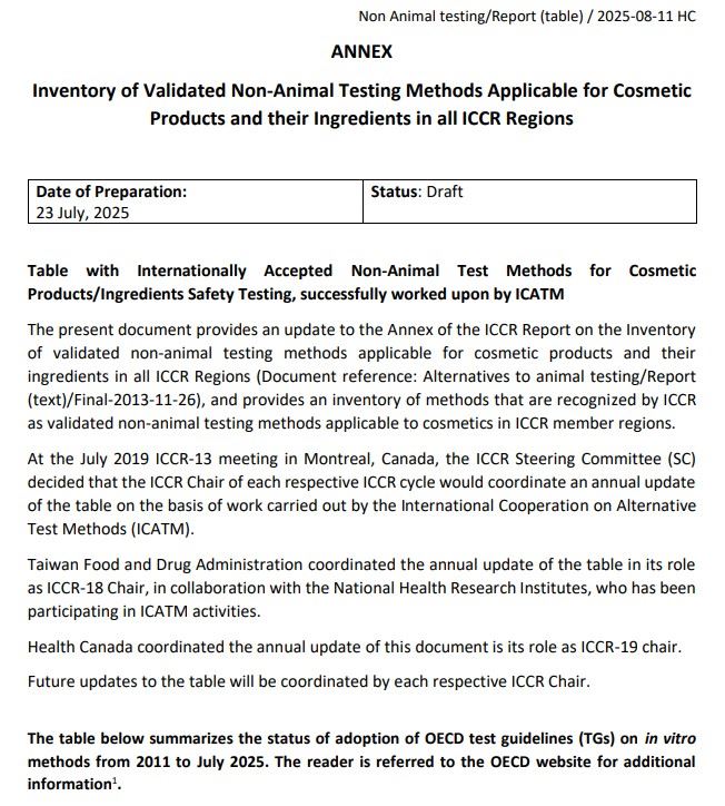 2025-Updated Annex of Validated Non-Animal Testing Methods Applicable for Cosmetics, 2025-11, Related Documents, Alternatives to animal testing, ICCR. (PDF)
