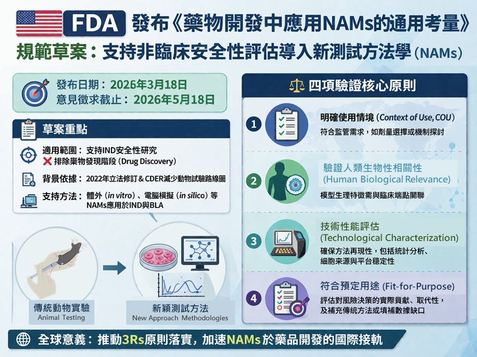 此規範草案的釋出對全球3Rs原則推進與落實NAMs於藥品開發極具重要的指標與意義。徵求意見截止2026年5月18日。