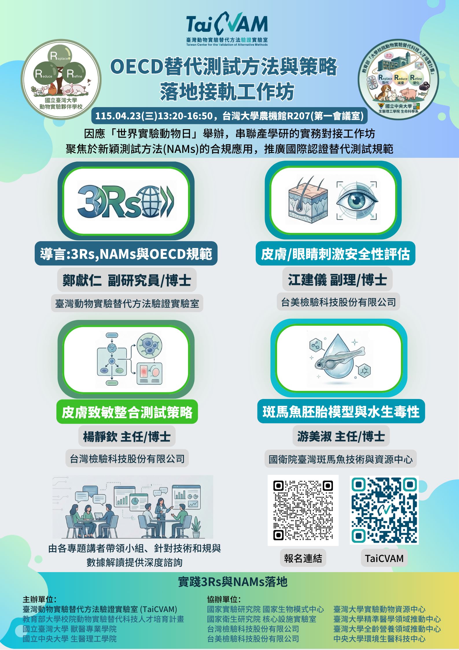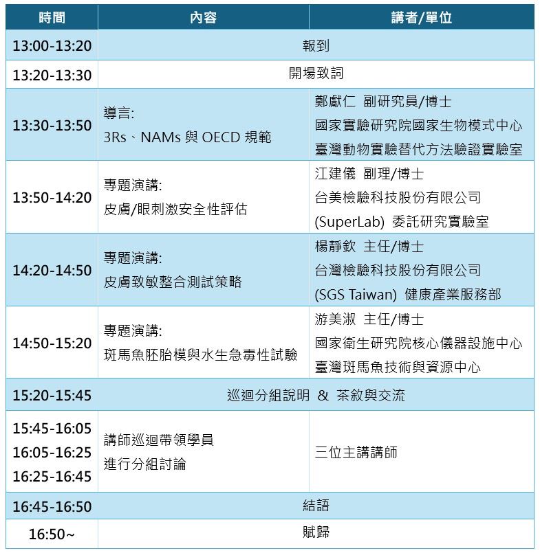 🔹 活動特色 本活動核心亮點在於「產學研深度對接、建立研究社群」:特邀具備國際發展趨勢觀察與檢測技術服務經驗之產業與法人專家擔任講師。活動前半段由國際發展與測試轉型導言,銜接三大核心毒性終點(皮膚/眼睛刺激、皮膚致敏、水生急毒性)之OECD替代測試規範深度解析。活動後半段以「分組巡迴討論」方式,由講師提供技術諮詢與實務經驗分享,針對學研端在導入替代測試時的實驗設計、合規疑慮與數據解讀提供精準建議。期望藉由業界實務經驗的導入,縮短科研開發與應用的轉型陣痛期,共同構建減少動物實驗的永續科研環境。